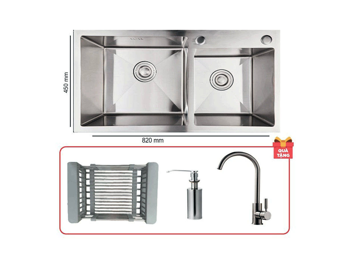 Thương hiệu Austar, Bảo hành 5 năm, Chất liêu: inox 304 dập, Chậu hộc đều: kích thước mỗi hộc 360 x 360mm, Thiết kế chống tràn, chống ồn, Thành chậu dày 1mm, Sản phẩm đi kèm bộ xả, quà tặng đính kèm: Bình xịt xà phòng trị giá 200.000đ, Khay rút đa năng trị giá 200.000đ, Vòi rửa chén lạnh Inox 304 trị giá 350.000đ.