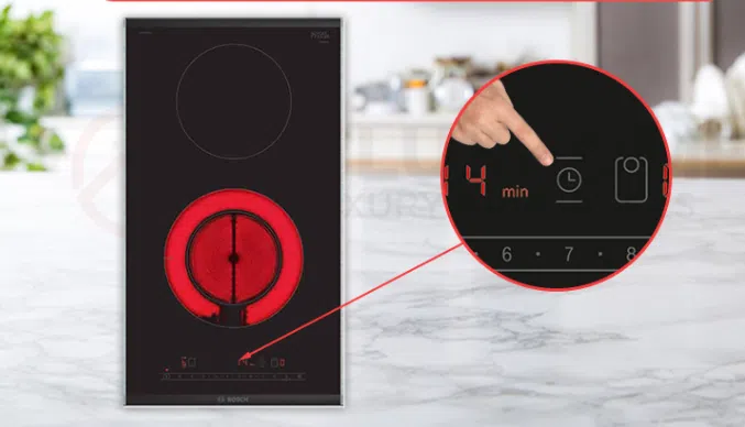 Đối với từng vùng nấu ăn bạn đề có thể thiết lập thời gian nấu. Chức năng hẹn giờ khi nấu ăn giúp bạn tiết kiệm được nhiều thời gian hơn. Những món kho, hầm cần nhiều thời gian nấu, bạn có thể cài đặt số phút cần nấu và nghỉ ngơi. Bếp điện Bosch PKF375FP2E sẽ tự động tắt sau khi hết thời gian nấu được cài đặt. Bạn sẽ nghe thấy âm thanh báo hiệu khi bếp tự ngắt.