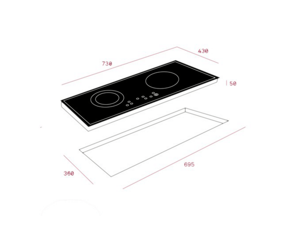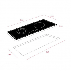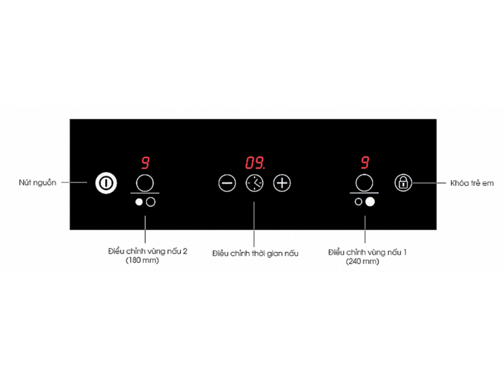 - 02 mặt bếp nấu:01 bếp có vòng nhiệt Ø 240mm; 01 bếp có vòng nhiệt Ø 185mm.