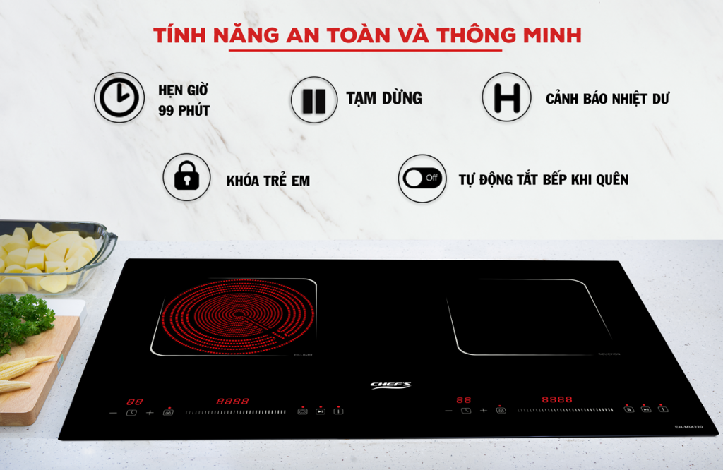 Cảnh báo nhiệt dư: Sau khi sử dụng, nếu vùng nấu mặt bếp còn nóng, màn hình LED sẽ hiển thị chữ H để cảnh báo để người dùng không chạm tay vào mặt bếp gây bỏng. Khi nhiệt độ mặt bếp giảm xuống mức an toàn, đèn báo chữ H sẽ tự động tắt.
