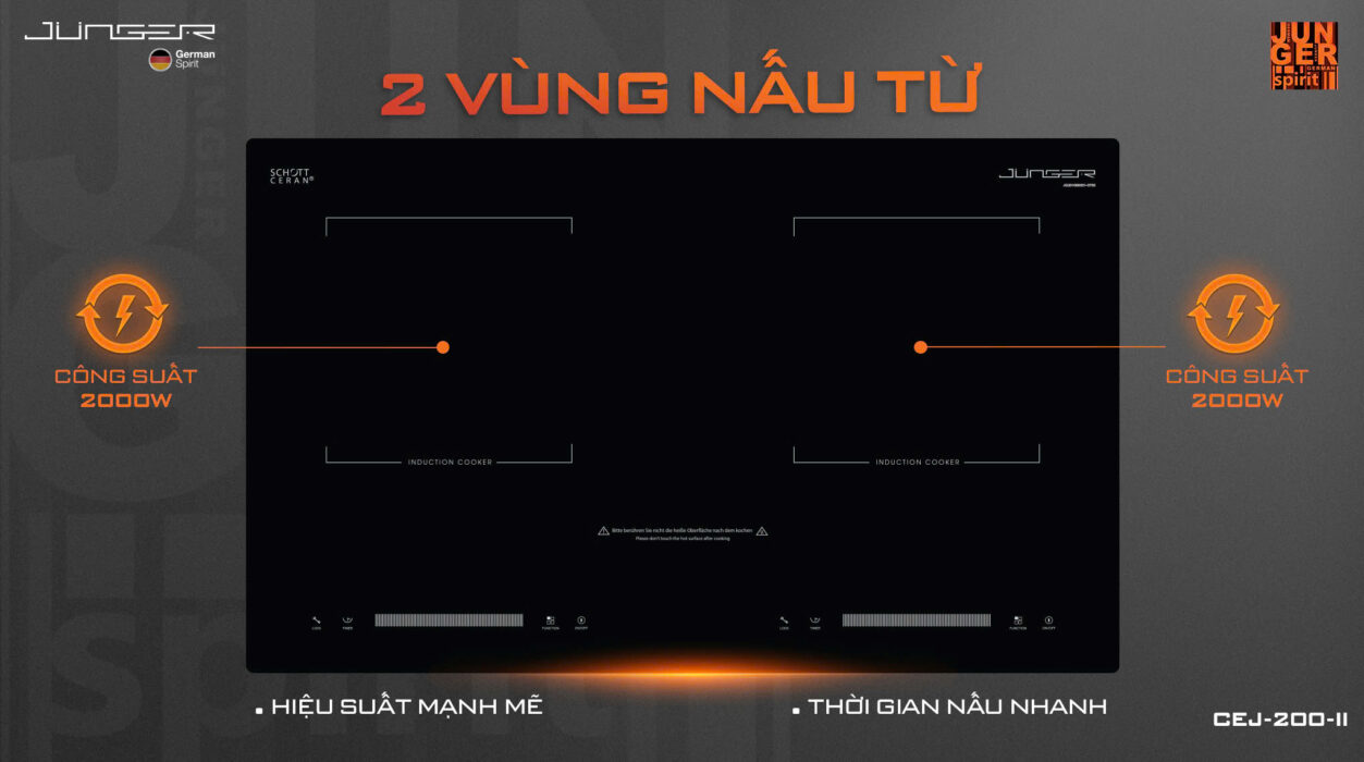 Bếp từ đôi Junger CEJ-200-II sở hữu thiết kế 2 vùng nấu độc lập giúp bạn nấu nướng nhiều món ăn cùng lúc, tiết kiệm thời gian nấu nước hiệu quả để tận hưởng những khoảnh khắc sum vầy bên gia đình.