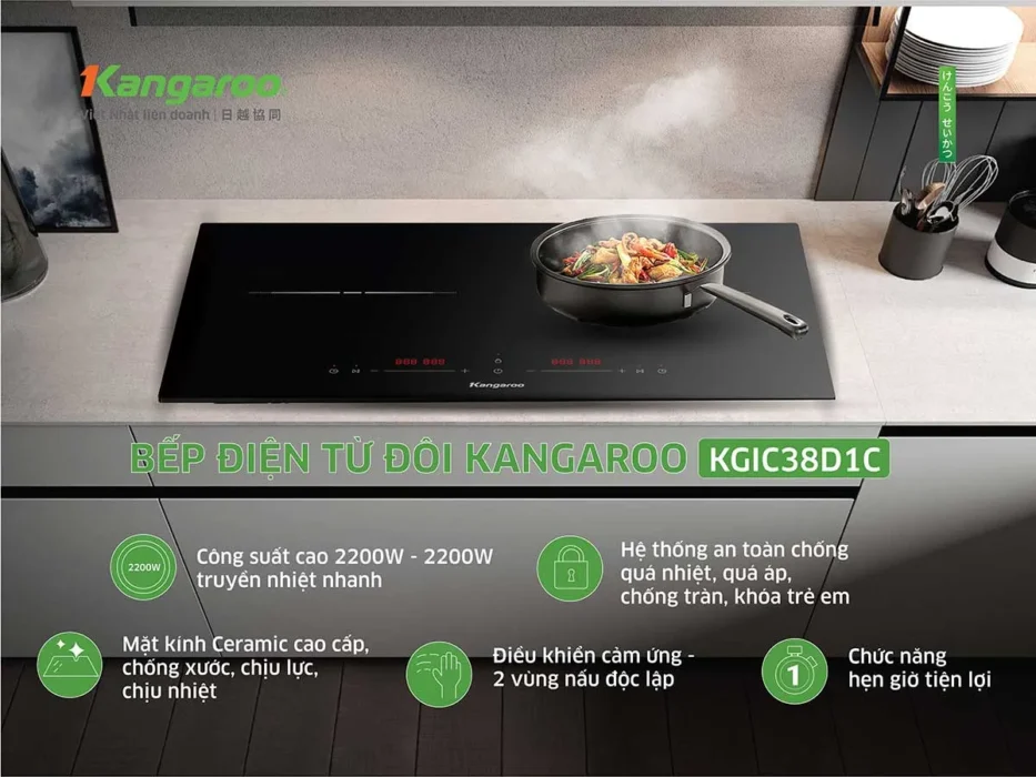 Bếp điện từ đôi Kangaroo KGIC38D1C có công suất cao, hiệu suất nhiệt ổn định, thiết kế mặt kính Ceramic cao cấp. Ngoài ra, bếp từ Kangaroo được tích hợp các công nghệ hiện đại như chống quá nhiệt, quá áp, chống tràn, khóa trẻ em và hẹn giờ tiện lợi.