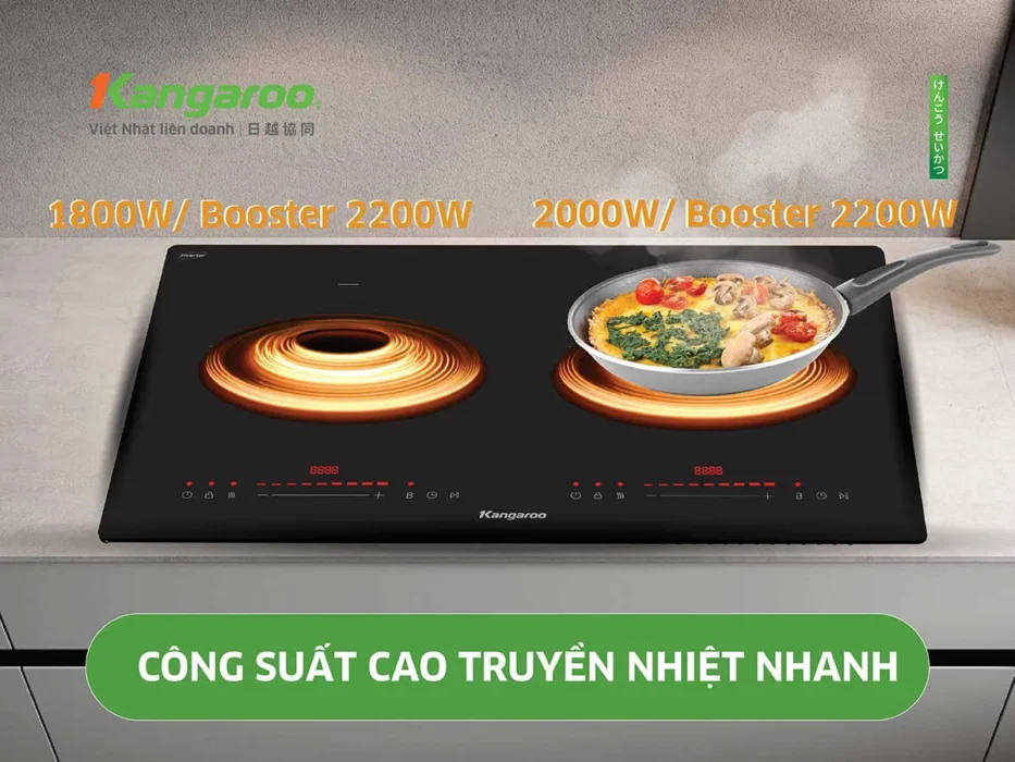 Khác với bếp gas truyền thống, để đun sôi 1 lít nước cần 10 – 15 phút. Bếp điện từ đôi Kangaroo KGIC44D1C công suất cao 2000W, công suất booster 2200W nên hiệu suất nhiệt cao chỉ mất 3 – 5 phút để sôi nước. Việc nấu ăn vô cùng nhẹ nhàng, tiết kiệm nhiên liệu và thời gian.