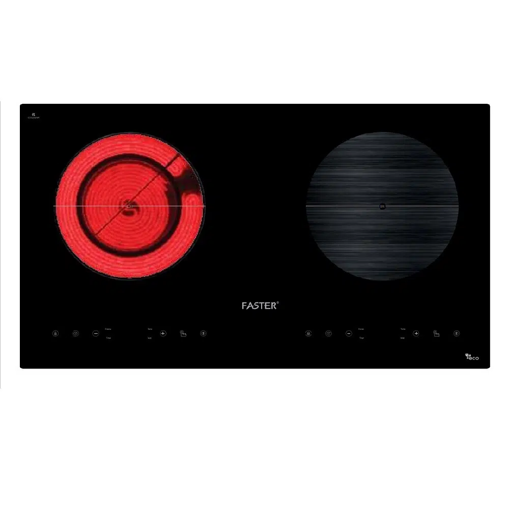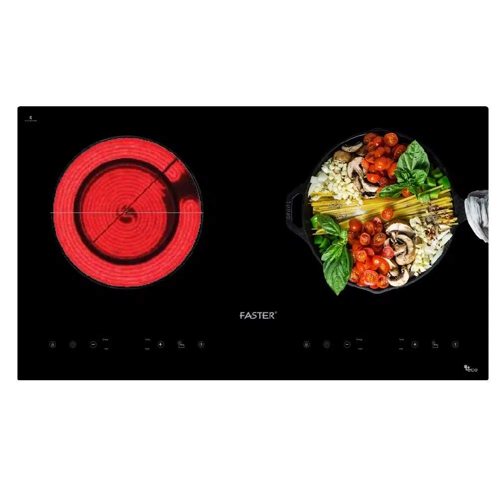 Bếp điện từ Faster FS 289HI gồm 2 vùng nấu với tổng công suất 4300W, 1 vùng nấu từ bên phải có khả năng đun nấu siêu nhanh và tiết kiệm điện năng với công suất 2000W có thể đạt mức công suất tối đa Booster 2000W và 1 vùng nấu hồng ngoại sử dụng mâm nhiệt 2 vòng nhiệt với vòng nấu nhỏ có công suất 800W, vòng nấu lớn có công suất 2300W.