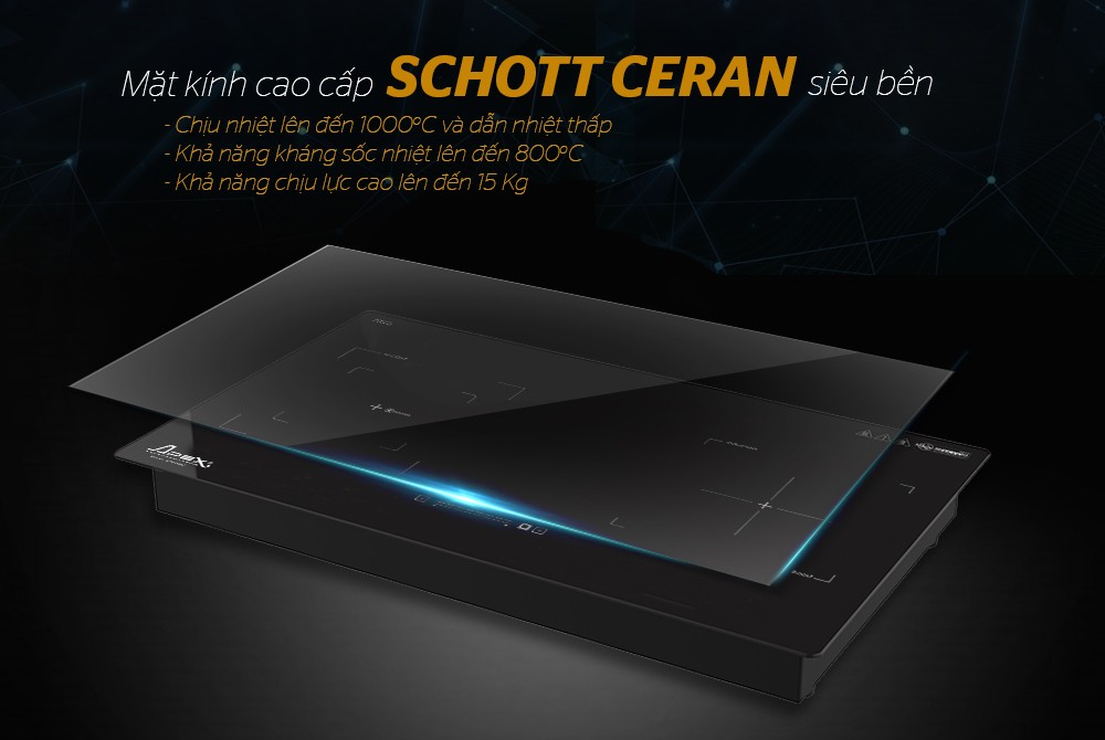 APB9982 sử dụng mặt kính Schott Ceran vát cạnh tinh tế. Đây là loại kính cao cấp, làm từ gốm sứ thủy tinh đặc biệt, siêu cứng, siêu bền, độ bền lên đến 20 năm và không chứa các chất độc hại với sức khỏe. Kính Schott Ceran có khả năng chịu nhiệt và chống sốc nhiệt lên tới 800oC nên không bị nứt vỡ khi thay đổi nhiệt đột ngột.