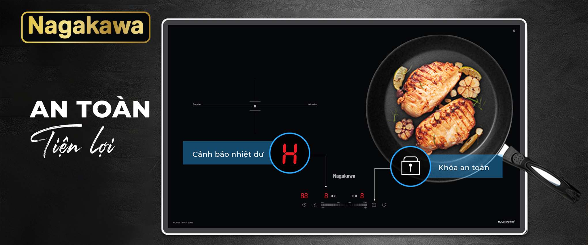 Bếp đôi điện từ Nagakawa UltraSlim NK2C29MB được trang bị các tính năng thông minh tiện lợi cho người sử dụng, đồng thời giúp nâng cao độ bền của bếp như: Công nghệ chống nhiệt lan tỏa, cảm ứng quá nhiệt, tự động ngắt bếp khi không có nồi đun nấu, dừng hoạt động khi thức ăn tràn xuống bếp,…