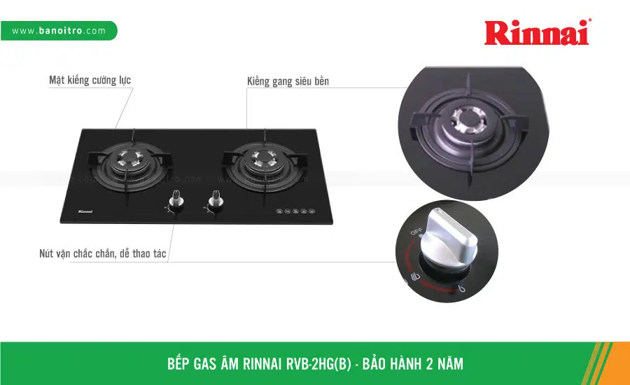 Bếp gas âm Rinnai RVB-2HG(B) sử dụng mặt kính cường lực, đánh lửa IC, đầu đốt đồng thau nguyên khối, ngắt gas tự động thuộc dòng bếp gas để bàn Công Nghệ Nhật Bản mới của thương hiệu thiết bị bếp nổi tiếng RINNAI, được sản xuất và lắp ráp tại nhà máy RINNAI Việt Nam và đạt danh hiệu hàng Việt Nam chất lượng cao.