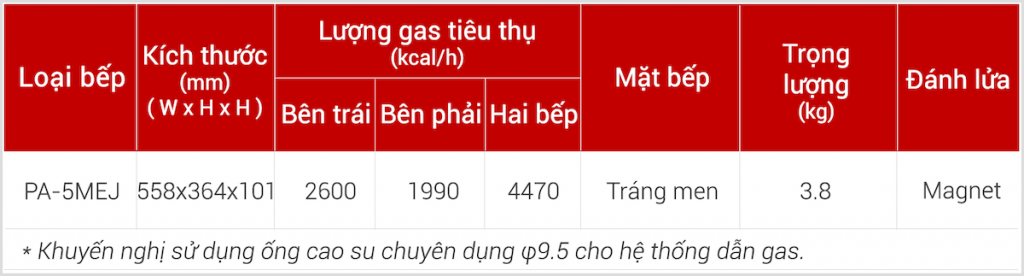 • Lượng gas tiêu thụ: 4470 kcal/h