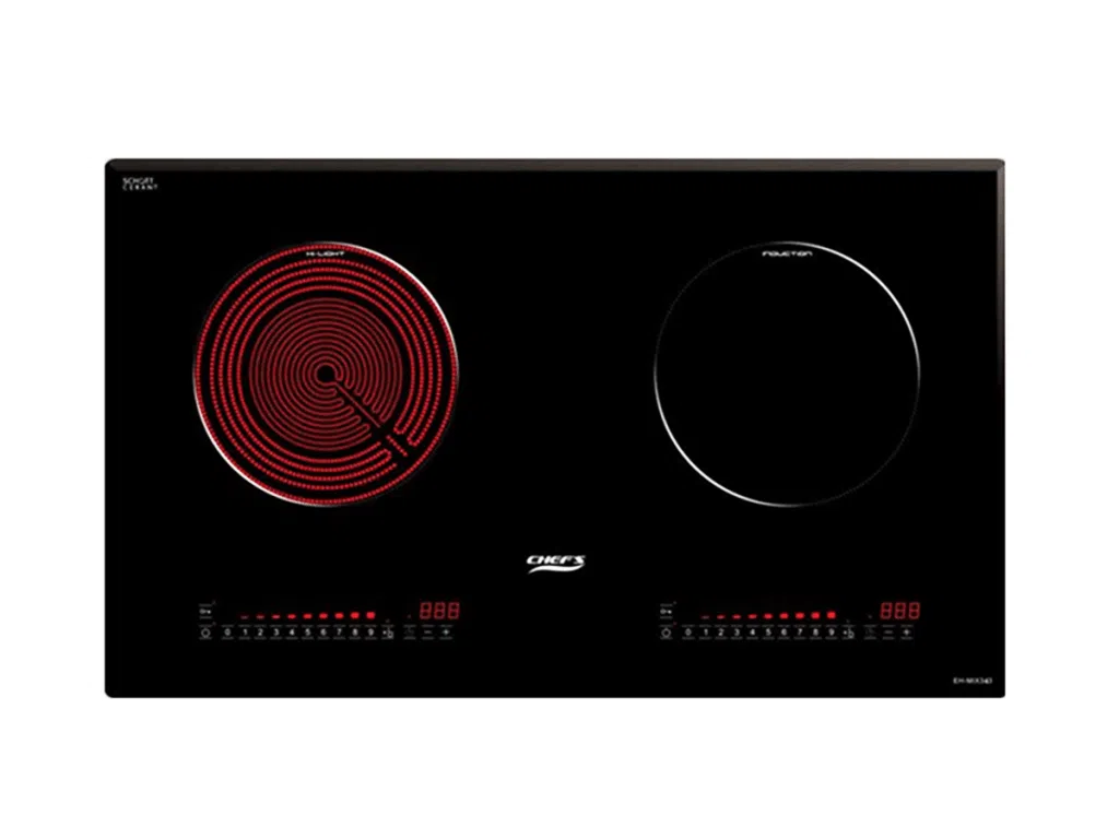 - Bếp điện từ Chefs EH-MIX343 với mâm nhiệt EGO Hi-light – Germany, tích hợp phím chức năng chọn vòng nấu