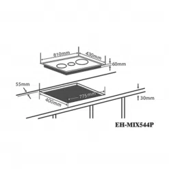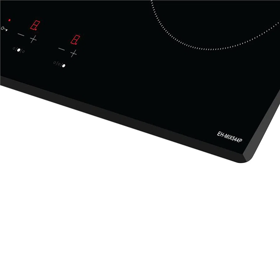 EH-MIX544P thiết kế 2 vùng nấu từ và 1 vùng nấu hồng ngoại phân bố dàn trải trên bề mặt kính. Vùng hồng ngoại ở vị trí ngoài cùng bên trái, sử dụng mâm nhiệt E.G.O với 2 vòng nhiệt (14/22cm), công suất 1900W.