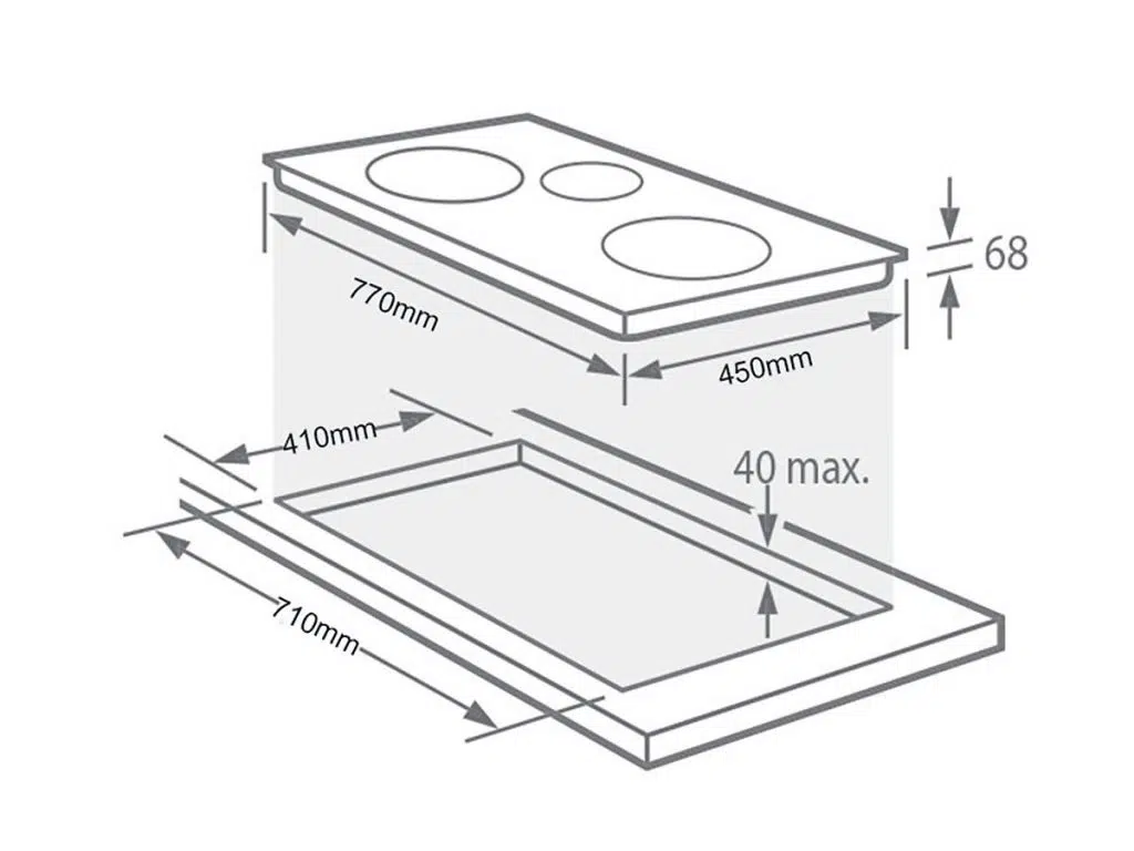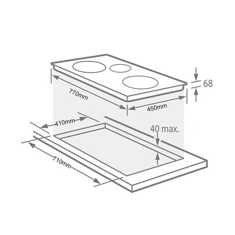 Vùng bên phải: Ø270mm – 2,3/3,0 kW (gia nhiệt nhanh) - Mặt gốm thủy tinh SCHOTT, vát cạnh trước 12mm
