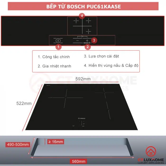 - Bếp Từ Bosch PUC61KAA5E sử dụng công suất tối đa khoảng 4600 W, sử dụng nguồn điện 220V – 240V với tần số 50/60 HZ.