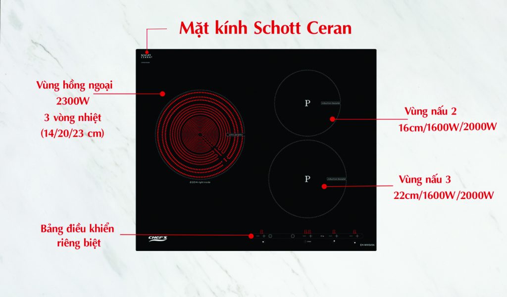 – Vùng nấu hồng ngoại sử dụng mâm nhiệt E.G.O Hi-light, 3 vòng nhiệt 14/20/23 cm phù hợp với nhiều kích thước đáy nồi, tránh hao hụt nhiệt năng trong quá trình sử dụng, công suất 2300W