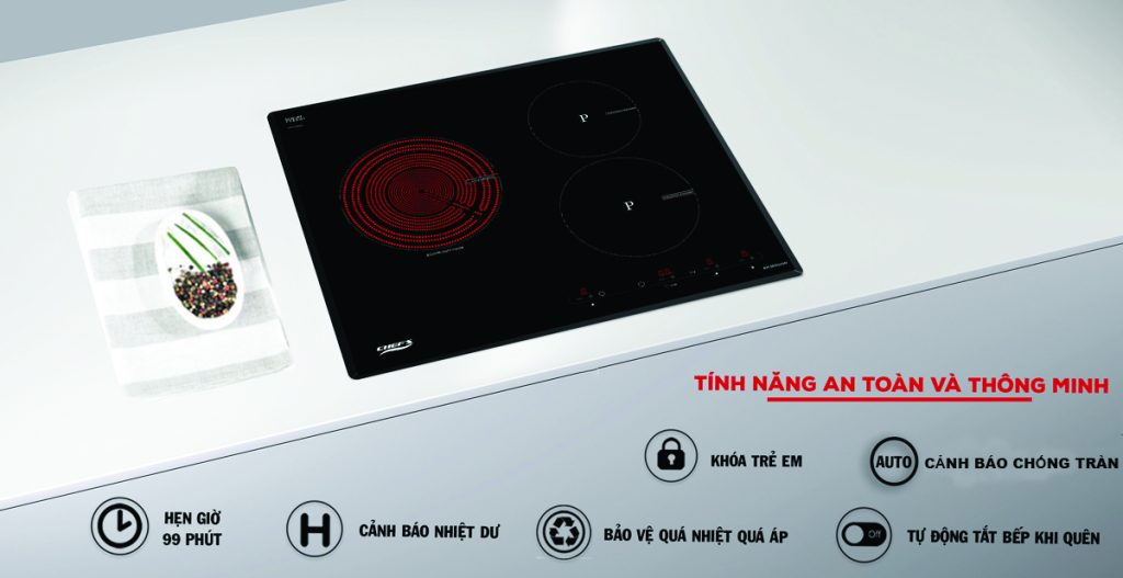Cảnh báo nhiệt dư: Sau khi sử dụng, nếu vùng nấu mặt bếp còn nóng, màn hình LED sẽ hiển thị chữ H để cảnh báo để người dùng không chạm tay vào mặt bếp gây bỏng. Khi nhiệt độ mặt bếp giảm xuống mức an toàn, đèn báo chữ H sẽ tự động tắt.