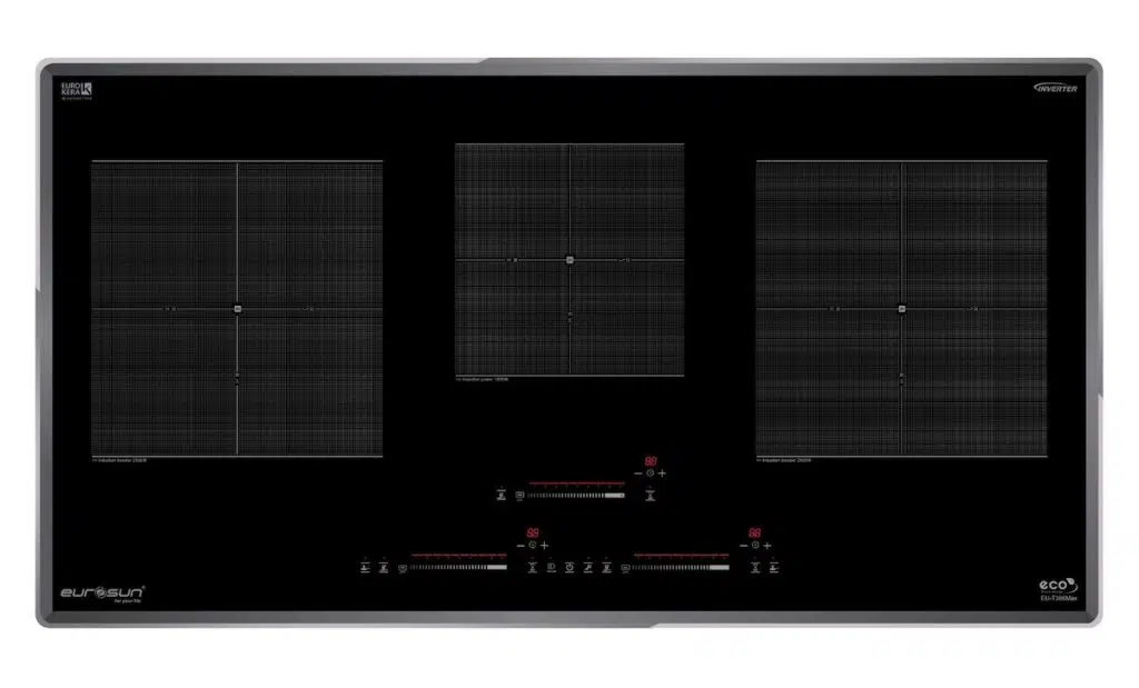 - Bếp từ Eurosun EU-T386Max sở hữu tới 3 vùng nấu rộng rãi giúp bạn chế biến đồng thời được nhiều món ăn cùng lúc. Mặt kính SCHOTT CERAN vát 4 cạnh, bo viền hợp kim nhôm cao cấp, tăng tính thẩm mỹ cao và có tác dụng bảo vệ mặt kính nhằm giảm thiểu va đập và sứt mẻ trong quá trình sử dụng.