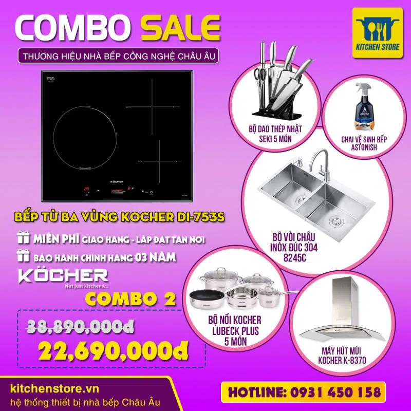 Bếp từ ba Kocher DI-753S được nhập khẩu nguyên chiếc từ Tây Ban Nha về thị trường Việt Nam đang được người dùng ưa chuộng với thiết kế bắt mắt, sang trọng và hiện đại đặc biệt sản phẩm sở hữu nhiều chức năng mới hỗ trợ người dùng trong quá trình nấu ăn.