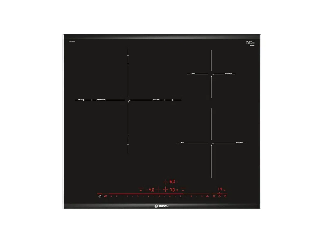 - Hiệu suất làm việc cao: Bếp từ Bosch PID675DC1E được đánh giá cao về hiệu suất làm việc với công suất nấu 3 vùng lần lượt là 3.3kW+2.2kW+1.4kW, tính năng booster tăng cường lượng nhiệt, nấu siêu nhanh, 17 mức công suất được chia nhỏ phù hợp theo mức nhiệt cho nhiều món nấu khác nhau.