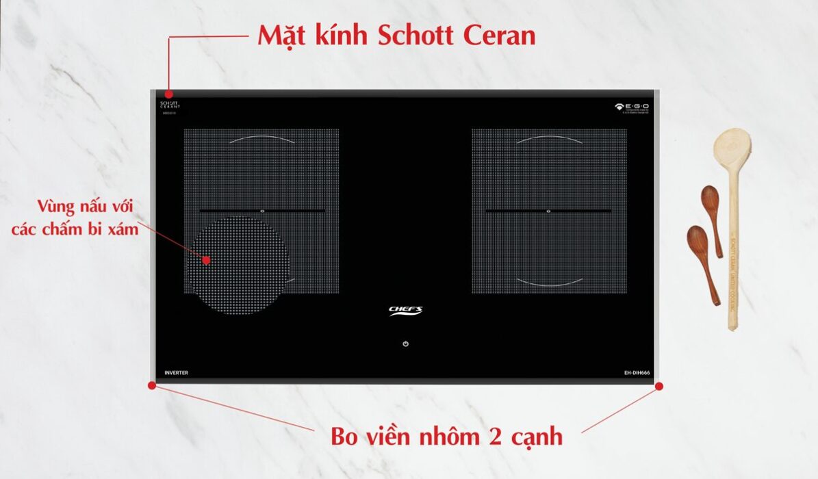 Bếp Chef’s EH-DIH666 sử dụng mặt kính Schott Ceran – made in Germany, thương hiệu mặt kính tốt nhất hiện nay dùng cho bếp điện từ. Kính Schott có khả năng chịu lực, chịu nhiệt cao, chịu nhiệt đến 1000°C, sốc nhiệt đến 800°C. Bề mặt kính được phủ sơn nano phẳng mịn, khó bám bẩn, dễ dàng vệ sinh, lau chùi.