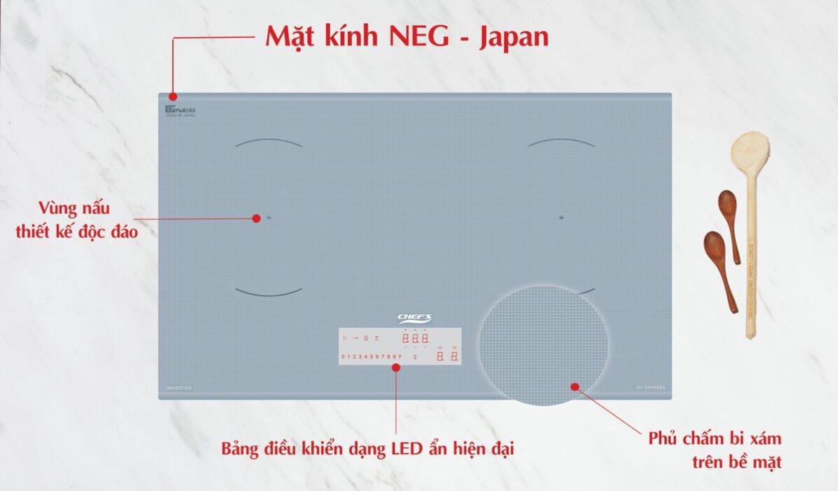 Bếp từ Chef’s EH-DIH666G có giao diện được thiết kế đơn giản và hiện đại. Mặt kính NEG có khả năng chịu lực chịu nhiệt cao. Bề mặt kính được thiết kế có các chấm bi xám nhỏ nổi bật .Hai vùng nấu được thể hiện đơn giản mà độc đáo.
