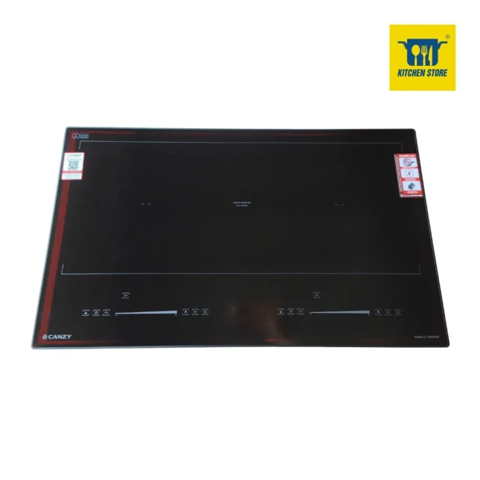 Bếp từ 2 vùng nấu sử dụng mặt kính Kanger Nano đen, bo viền nhôm sang trọng.