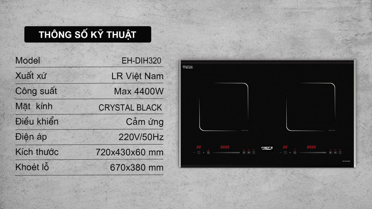Bếp từ đôi EH-DIH320 được lắp ráp tại Việt nam theo tiêu chuẩn công nghệ châu Âu. Bếp sử dụng mặt kính Crystal BLACK siêu bền. Bề mặt kính phẳng, sáng mịn làm nổi bật không gian bếp. Kính được vát cạnh, bo viên nhôm 2 bên giúp hạn chế nứt vỡ mặt kính.