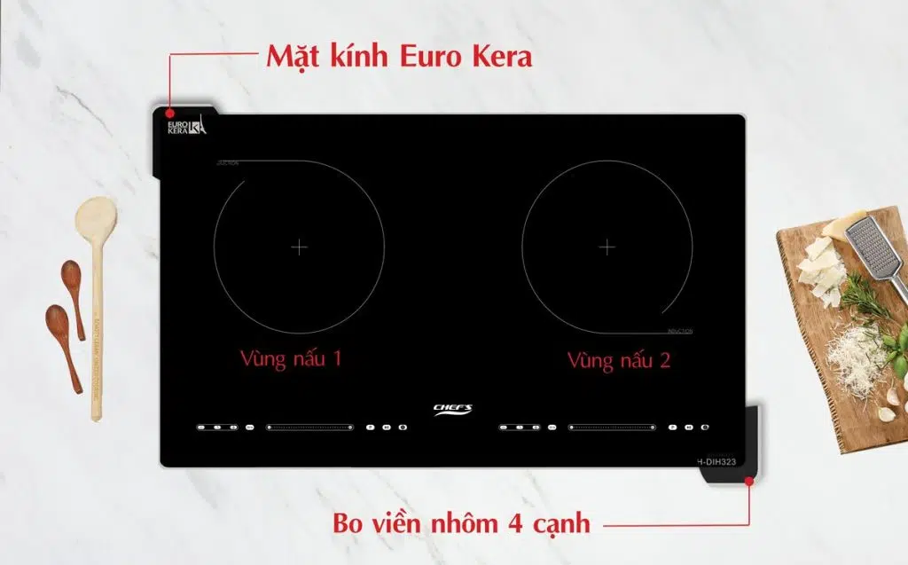 Bếp từ đôi EH-DIH323 sử dụng mặt kính Euro Kera số 1 tại Pháp, bo viền nhôm 2 cạnh bảo vệ mặt kính. Kính được làm từ sợi gốm Ceramic thủy tinh siêu bền, có khả năng chịu