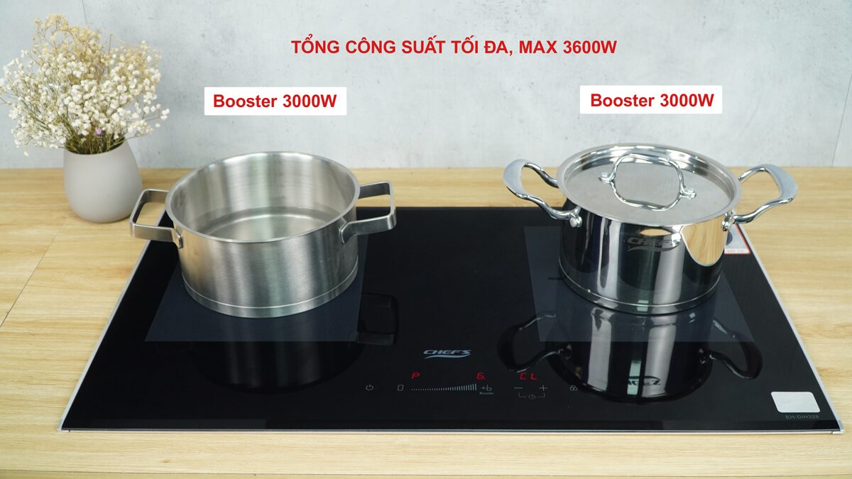 Bếp có tính năng tự động chia sẻ công suất, tối đa Max 3600W. Khi tổng công suất trên bếp đang đạt 3600W, nếu một vùng nấu tăng mức công suất, vùng nấu còn lại sẽ tự động giảm, để đảm bảo mức công suất tối đa. Điều này giúp bảo vệ an toàn nguồn điện và tăng tuổi thọ cho bếp.