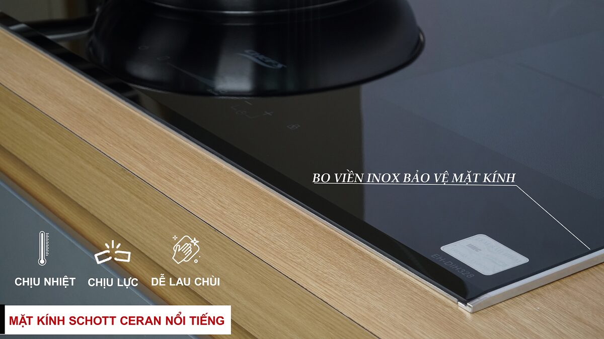 Bếp từ đôi EH-DIH328 có linh kiện được nhập khẩu từ hãng E.G.O – Đức, được lắp ráp tại Việt nam theo tiêu chuẩn công nghệ châu Âu. Bếp sử dụng mặt kính Schott Ceran – thương hiệu mặt kính nổi tiếng được dùng phổ biến trên bếp từ.
