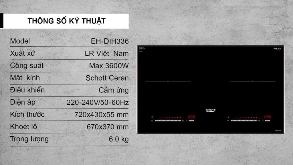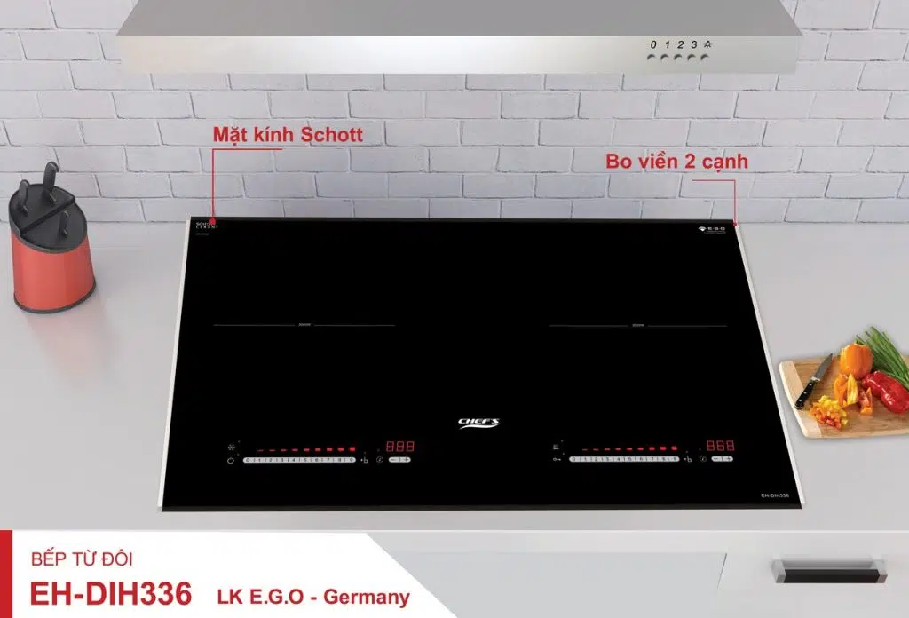 Bếp từ đôi EH-DIH336 có linh kiện được nhập khẩu từ hãng E.G.O – Đức, được lắp ráp tại Việt nam theo tiêu chuẩn công nghệ châu Âu. Bếp sử dụng mặt kính Schott Ceran – thương hiệu mặt kính nổi tiếng được dùng phổ biến trên bếp từ.