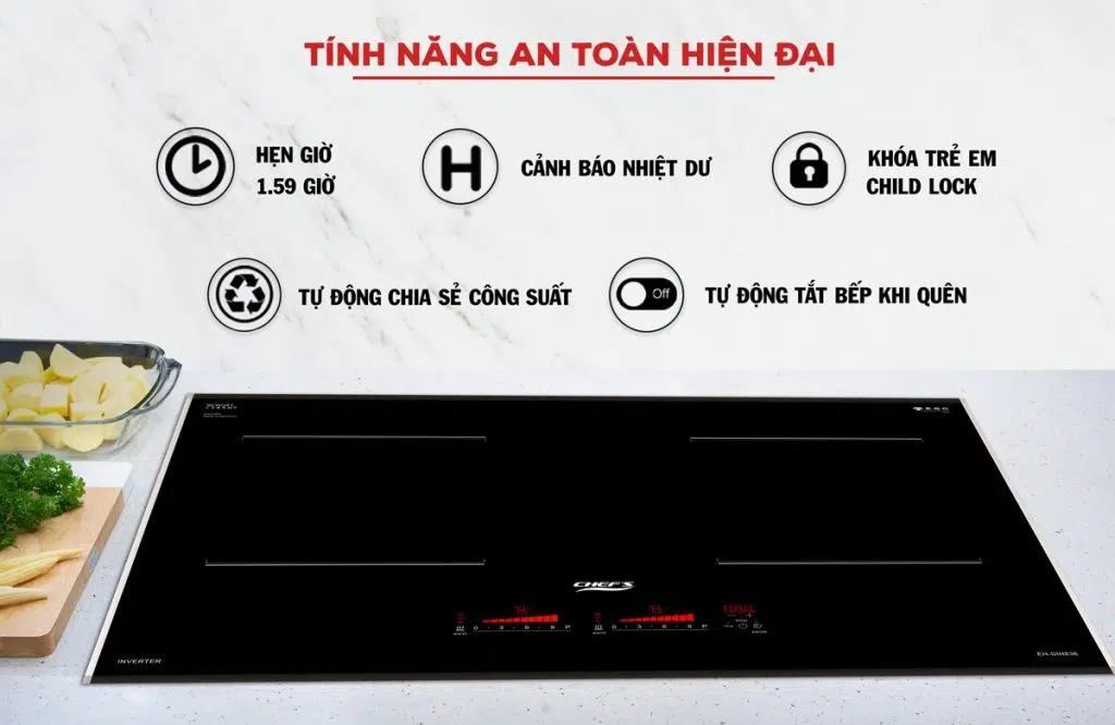 Cảnh báo nhiệt dư: Sau khi sử dụng, nếu vùng nấu mặt bếp còn nóng, màn hình LED sẽ hiển thị chữ H để cảnh báo để người dùng không chạm tay vào mặt bếp gây bỏng.
