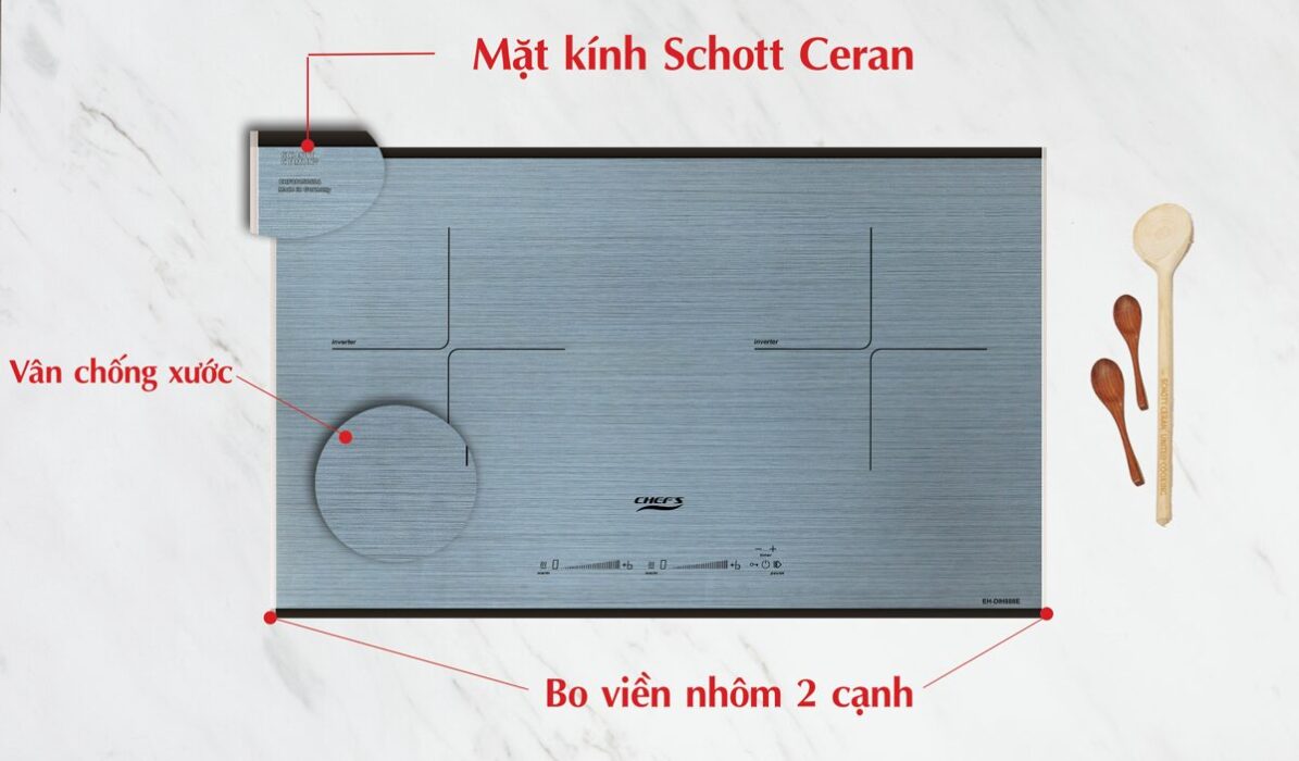 Bếp từ đôi EH-DIH888E sử dụng mặt kính ceramic chịu nhiệt Schott Ceran (Đức) vát 2 cạnh trước sau và bo viền nhôm 2 bên giúp hạn chế tối đa các va chạm dẫn đến vỡ mặt kính. Mặt kính Schott có khả năng chịu lực cao, chịu nhiệt đến 1000oC, chống sốc nhiệt đến 800oC.