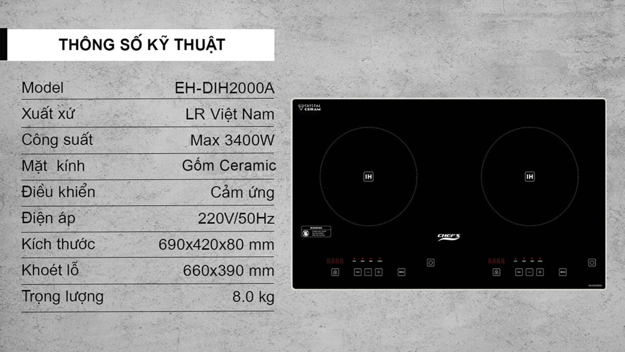 EH-DIH2000A là dòng bếp từ đôi thuộc Serie model 2000A thương hiệu Chef’s. Bếp có thể lắp đặt âm hoặc để nổi, kích thước 690 x 420 x 80 (mm), phù hợp với đa dạng không gian bếp và nhu cầu sử dụng của khách hàng.