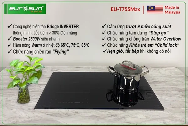 BẾP TỪ EUROSUN EU-T755Max Tiết kiệm 30% điện năng bởi tích hợp công nghệ biến tần Bridge INVERTER cảm biến thông minh giúp cố định công suất tiêu thụ điện khi đun nấu, khả năng đun liu riu ở các mức công suất thấp, giữ cho bếp gia nhiệt duy trì ổn định, không bị đóng ngắt liên tục như các dòng bếp thông thường.