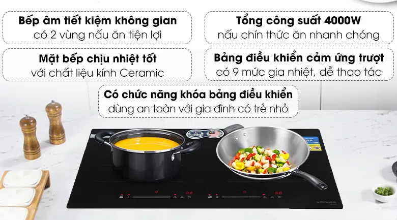 Bếp từ đôi Kocher DI-669 với nhiều chức năng thông minh như chức năng khóa trẻ em, hẹn giờ nấu, chống tràn, an toàn tuyệt đối cho gia đình bạn, giúp bạn an tâm có thêm thời gian để làm việc khác hoặc thư giản trong khi nấu ăn.