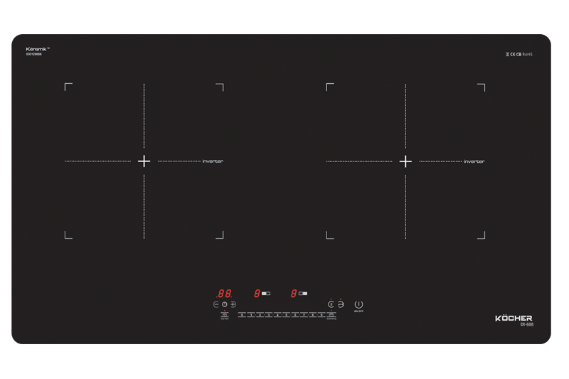 Bếp từ đôi Kocher DI-688 có 2 vùng nấu, mặt bếp được làm bằng gốm thủy tinh Ceramic, vát 4 cạnh tinh tế, sang trọng, chịu nhiệt tốt, vệ sinh dễ dàng. Chức năng điều khiển chọn trực tiếp cùng 9 mức gia nhiệt, giúp việc nấu nước trở nên đơn giản và nhanh chóng.