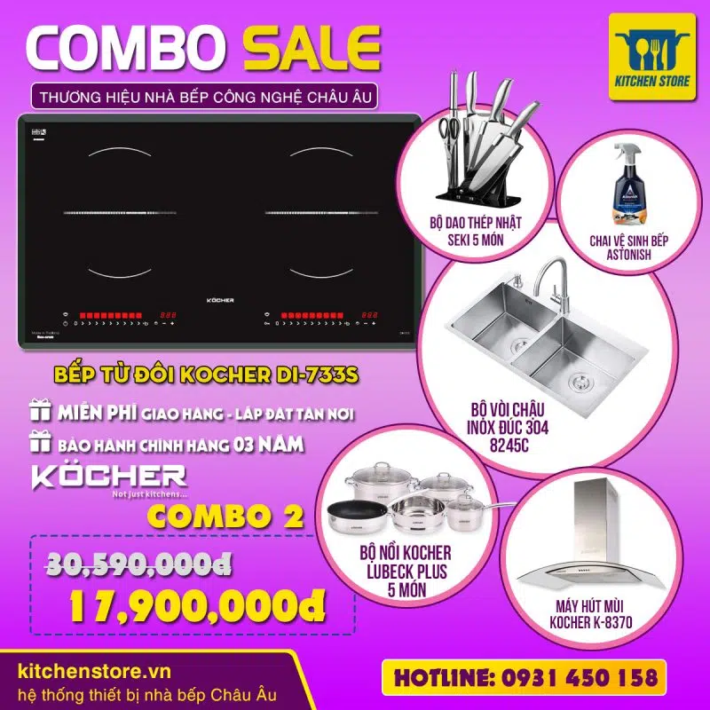 Bếp từ đôi Kocher DI-733S thuộc dòng bếp từ đôi nhập khẩu từ Đức, sản phẩm có thiết kế chữ nhật liền nguyên khối, thiết kế vát cạnh xung quanh đẹp mắt, sử dụng mặt kính EuroKera (Pháp) có khả năng chịu nhiệt, chịu sốc nhiệt tốt, chịu lực nén cao. Mặt kính chống trầy xước, có khả năng chống bám bụi, dễ dàng vệ sinh sau mỗi lần sử dụng. Thân bếp được làm bằng thép không gỉ, quạt tản nhiệt hoạt động linh hoạt, giúp đẩy nhanh lượng nhiệt nóng phát sinh trong quá trình nấu nướng.