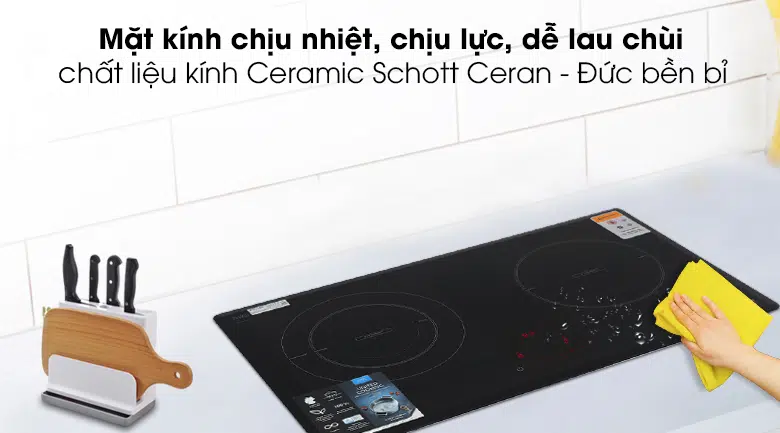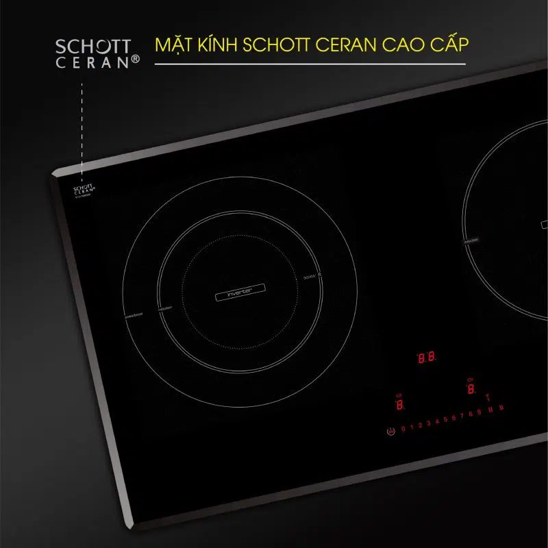 Bếp từ đôi Kocher DI-881GE thuộc dòng bếp từ đôi nhập khẩu từ Đức, sản phẩm có thiết kế chữ nhật liền nguyên khối, thiết kế vát cạnh xung quanh đẹp mắt, sử dụng mặt kính Schott Ceran (Đức) có khả năng chịu nhiệt lên đến 1000 độ C, chịu lực lên đến 15kg. Mặt kính chống trầy xước, có khả năng chống bám bụi, dễ dàng vệ sinh sau mỗi lần sử dụng. Thân bếp được làm bằng thép không gỉ, quạt tản nhiệt hoạt động linh hoạt, giúp đẩy nhanh lượng nhiệt nóng phát sinh trong quá trình nấu nướng.