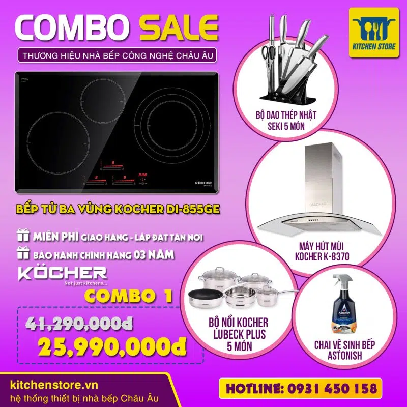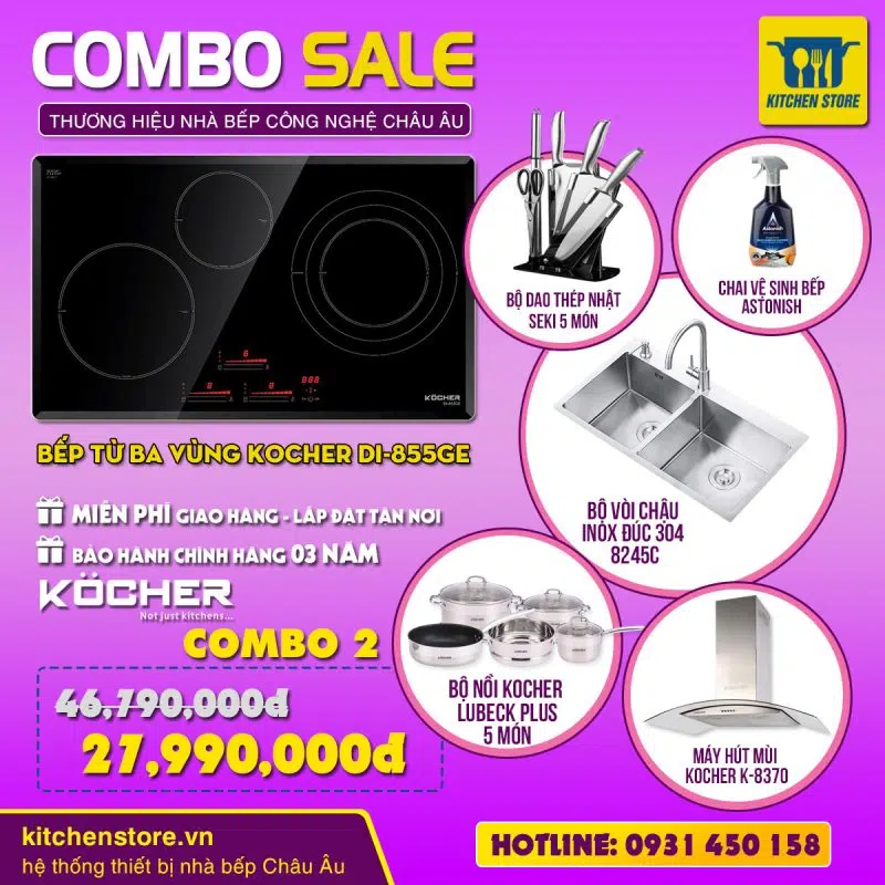 Bếp từ ba Kocher DI 855GE được nhập khẩu nguyên chiếc từ Đức về thị trường Việt Nam đang được người dùng ưa chuộng với thiết kế bắt mắt, sang trọng và hiện đại đặc biệt sản phẩm sở hữu nhiều chức năng mới hỗ trợ người dùng trong quá trình nấu ăn.
