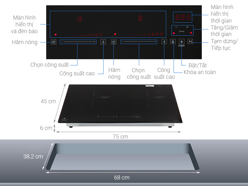 – Tính năng an toàn: Cảnh báo mặt bếp nóng, Khóa bảng điều khiển, Tự ngắt khi bếp nóng quá tải, Tự nhận diện kích cỡ đáy nồi, Tự tắt bếp khi nước tràn đến bảng điều khiển