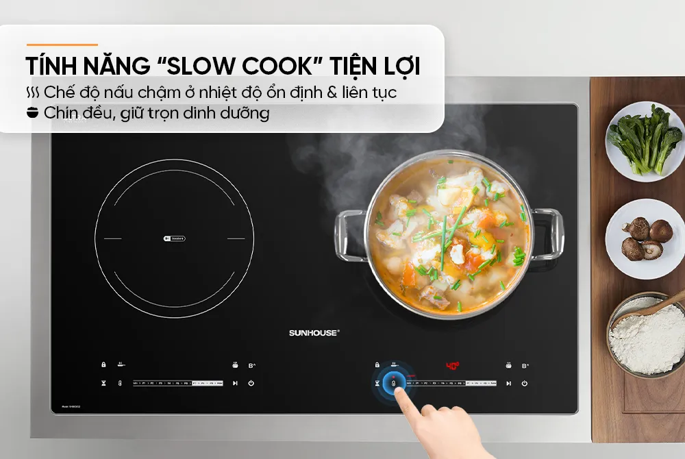 Nhằm nâng cao trải nghiệm sử dụng, bếp còn được tích hợp nhiều chế độ nấu nướng tiện lợi như chế độ chiên, xào, nấu nhanh… Đặc biệt, tính năng “SLOW COOK” – chế độ nấu chậm ở nhiệt độ thấp và ổn định trong suốt quá trình nấu, không bị đóng ngắt liên tục như các dòng bếp từ thông thường, giúp kiểm soát và đảm bảo nhiệt độ luôn chính xác. Điều này rất quan trọng đối với những món ăn cần nhiệt độ thấp như ninh, hầm, kho… và tạo hương vị mà không bị chín quá hoặc cháy, chính vì vậy món ăn giữ được hàm lượng chất dinh dưỡng cao, gần như là nguyên vẹn.