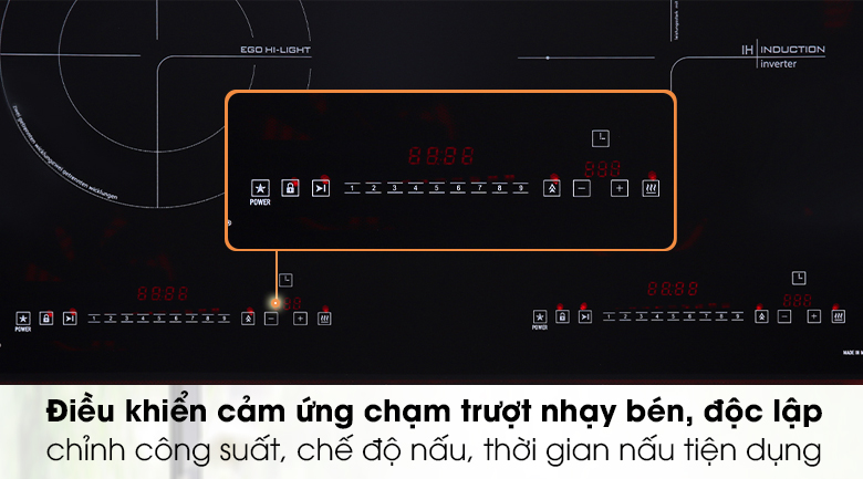 Bảng điều khiển cảm ứng trượt thao tác hiện đại. Thiết kế độc lập cho từng vùng nấu cùng với 9 mức công suất tùy chỉnh.