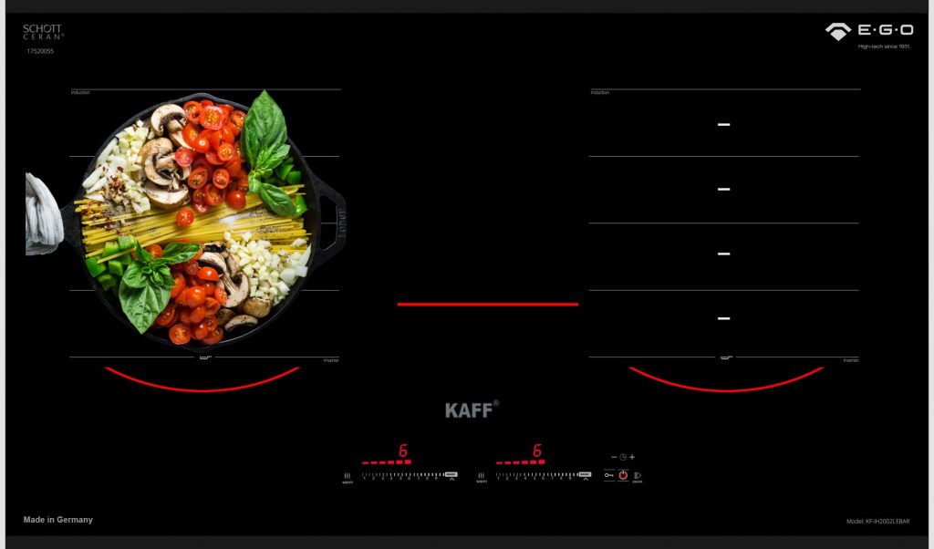 Bếp từ Kaff KF-IH2002LEBAR gồm 2 vùng nấu với tổng công suất 4000W. Vùng nấu trái có công suất là 2300W khi kích hoạt tính năng Booster công suất lên tới 3700W. Vùng nấu phải có công suất là 2300W khi kích hoạt tính năng Booster công suất lên tới 3700W. Chỉ trong chốc lát sau khi kích hoạt tính năng này, nhiệt lượng trên vùng nấu từ tăng lên công suất tương đương với mức nhiệt lượng lớn nhất. Do đó, các món ăn được nấu chín nhanh hơn, tiết kiệm thời gian vào bếp cho chị em nội trợ. Chức năng Booster nấu siêu nhanh, tuy nhiên thời gian tối đa mặc định dùng chức năng này là 10 phút / lần tránh quá tải.