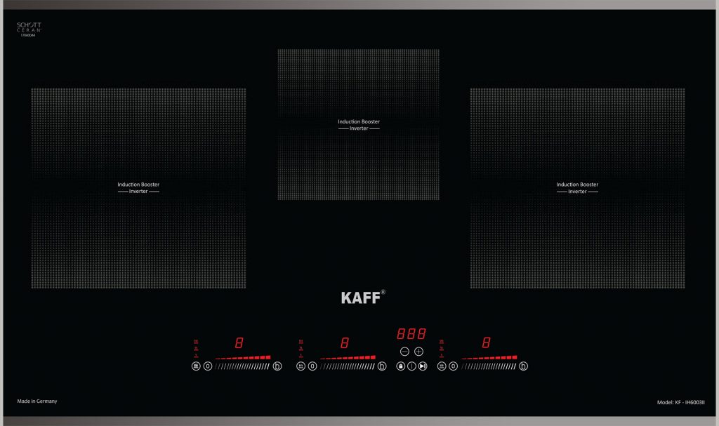 Bếp từ Kaff KF-IH6003II gồm 3 vùng nấu có tổng công suất 6100W. Vùng nấu từ lớn bên trái với công suất 2300W có khả năng đun nấu siêu nhanh và tiết kiệm điện năng có thể đạt mức công suất tối đa 3700W. Vùng nấu từ nhỏ ở giữa với công suất 1500W có khả năng đun nấu siêu nhanh và tiết kiệm điện năng có thể đạt mức công suất tối đa 2800W. Vùng nấu từ lớn bên phải với công suất 2300W có khả năng đun nấu siêu nhanh và tiết kiệm điện năng có thể đạt mức công suất tối đa 3700W. Chức năng nhận diện vùng nấu chỉ sinh nhiệt vùng đáy nồi, tránh nồi thất thoát nhiệt ra ngoài. Chức năng Booster ở vùng từ nấu siêu nhanh, tuy nhiên thời gian tối đa mặc định dùng chức năng này là 10 phút/lần tránh quá tải.