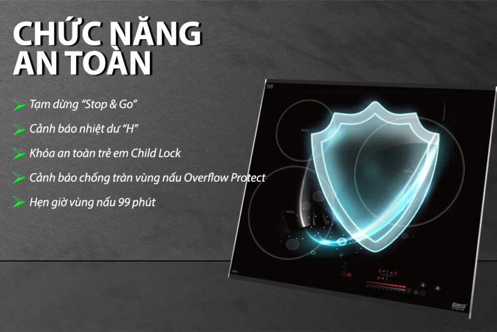 Tính năng chống tràn Overflood Protection: Khi có nước sôi vô tình tràn trong khi nấu, nước tràn đến khu vực bàn phím điều khiển, sau khoảng 3-10 giây bếp sẽ tự động ngừng hoạt động.