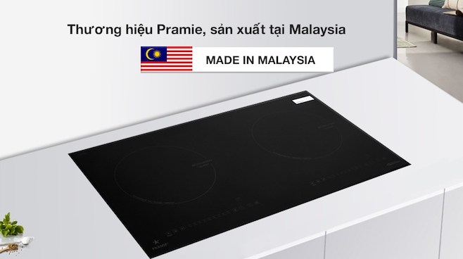 Bếp từ đôi Pramie có kiểu dáng đơn giản, hiện đại được thiết kế lắp âm giúp tối ưu không gian cho căn bếp.