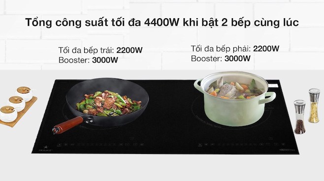 Mỗi vùng bếp trái – phải đều có công suất 2200/3000W, cùng với chức năng gia nhiệt nhanh, cho khả năng nấu nướng nhiều món cùng lúc, tiết kiệm công sức người dùng.