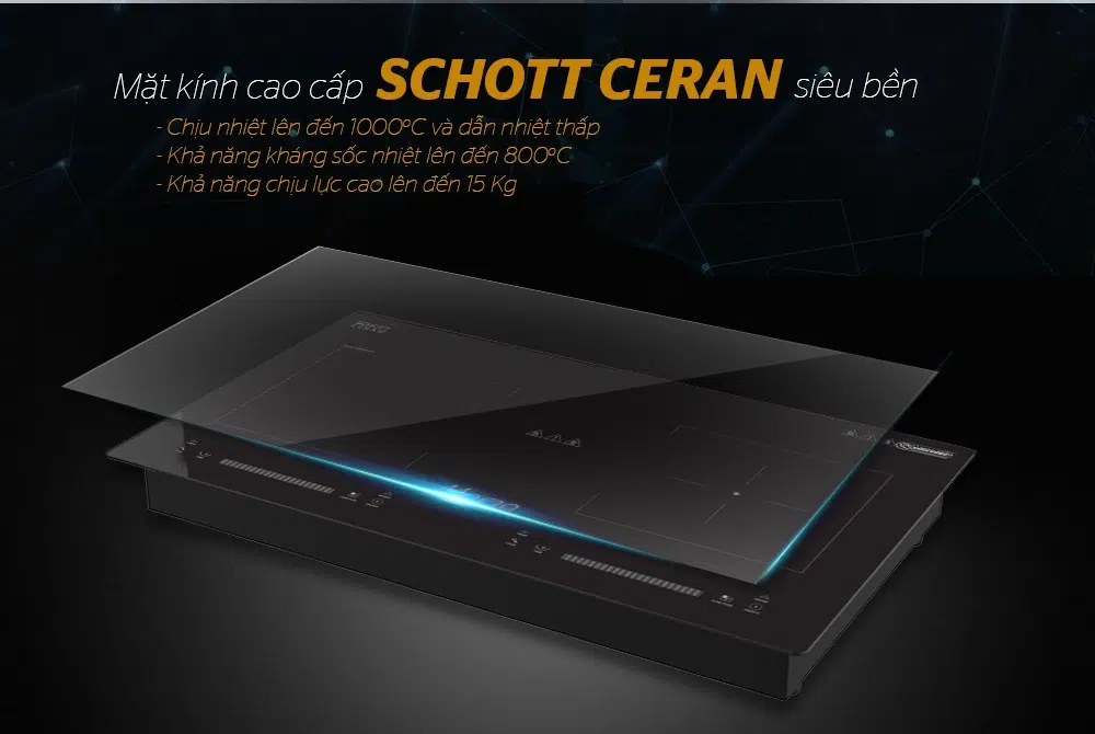 SUNHOUSE MAMA MMB9208DIH sử dụng mặt kính Schott Ceran cao cấp bền bỉ, chắc chắn. Loại chất liệu này có khả năng chống sốc nhiệt tốt lên tới 800 độ C và không chứa các kim loại nặng có hại cho sức khỏe. Ngoài ra, kính Schott Ceran còn nổi tiếng với bề mặt chống trầy xước và khả năng chịu lực cao lên đến 15kg.