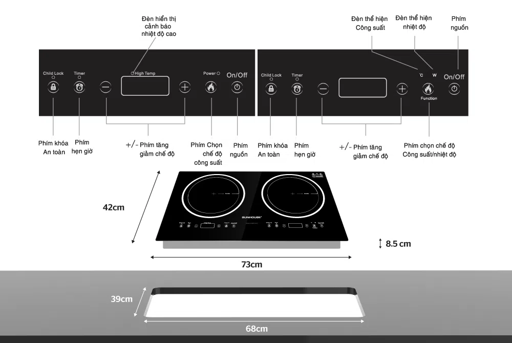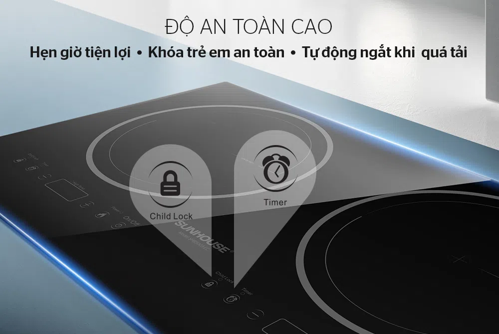Bếp đôi điện từ SUNHOUSE SHB9003-EC được trang bị nhiều tính năng hiện đại như hẹn giờ, khóa trẻ em và tự động ngắt khi quá tải giúp đảm bảo an toàn cho người sử dụng và nâng cao độ bền cho bếp.