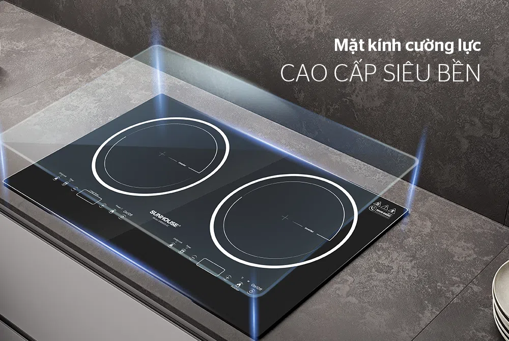 Bếp đôi điện từ SUNHOUSE SHB9003-EC sử dụng mặt kính siêu bền chống trầy xước tốt, có khả năng chịu lực, chịu nhiệt tốt, an toàn khi sử dụng và dễ lau chùi.