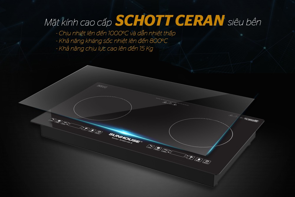 SHB9108-S sử dụng mặt kính Schott Ceran vát cạnh tinh tế. Đây là loại kính cao cấp, làm từ gốm sứ thủy tinh đặc biệt, siêu cứng, siêu bền, độ bền lên đến 20 năm và không chứa các chất độc hại với sức khỏe. Kính Schott Ceran có khả năng chống sốc nhiệt và chịu được nhiệt lên tới 800oC nên không bị nứt vỡ khi thay đổi nhiệt đột ngột.